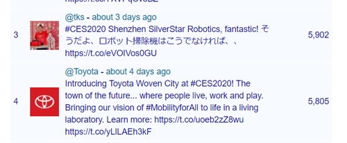 ハッシュタグごとにツイートを分析するサイトaka.tvが掲載したCES2020でのランキング。ロボット掃除機へのツイートは大きな注目を集めた